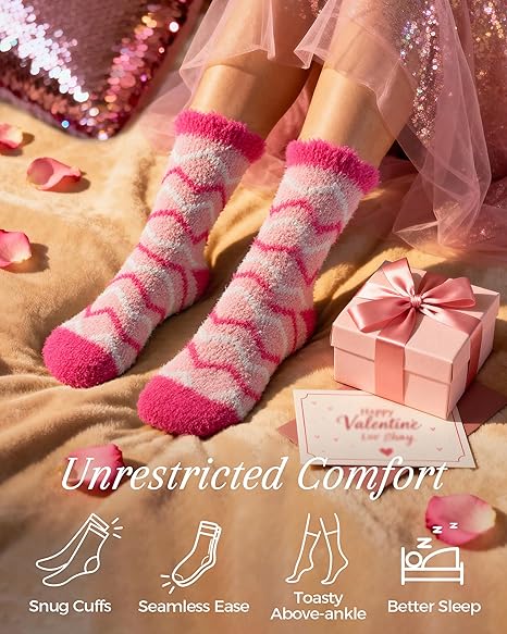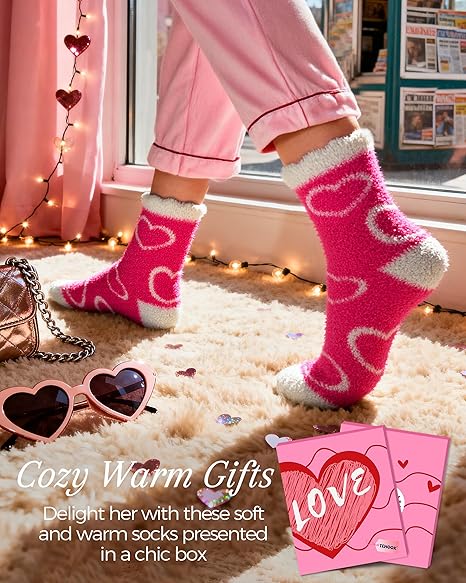 • Step into Heartfelt Warmth: 5 pairs of ultra‑soft fuzzy pink socks with adorable heart patterns; perfect Valentine’s Day gifts. Tuck them into her Valentine basket as sweet surprises she’ll love. Cozy, cute, and full of heart